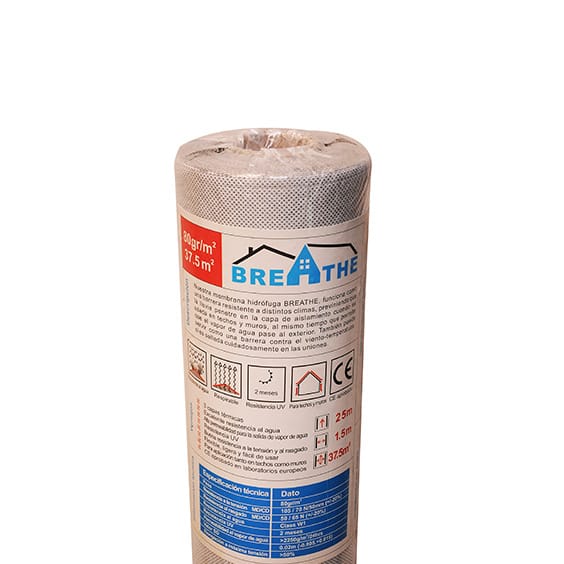 Uno de las principales puntos a tener en cuenta al momento de elegir una membrana hidrófuga es el gramaje, lo cual influye finalmente en las propiedades del producto. Nuestra membrana Breathe es de 80gr/M², lo cual garantiza excelentes propiedades de resistencia y permeabilidad al vapor de agua.